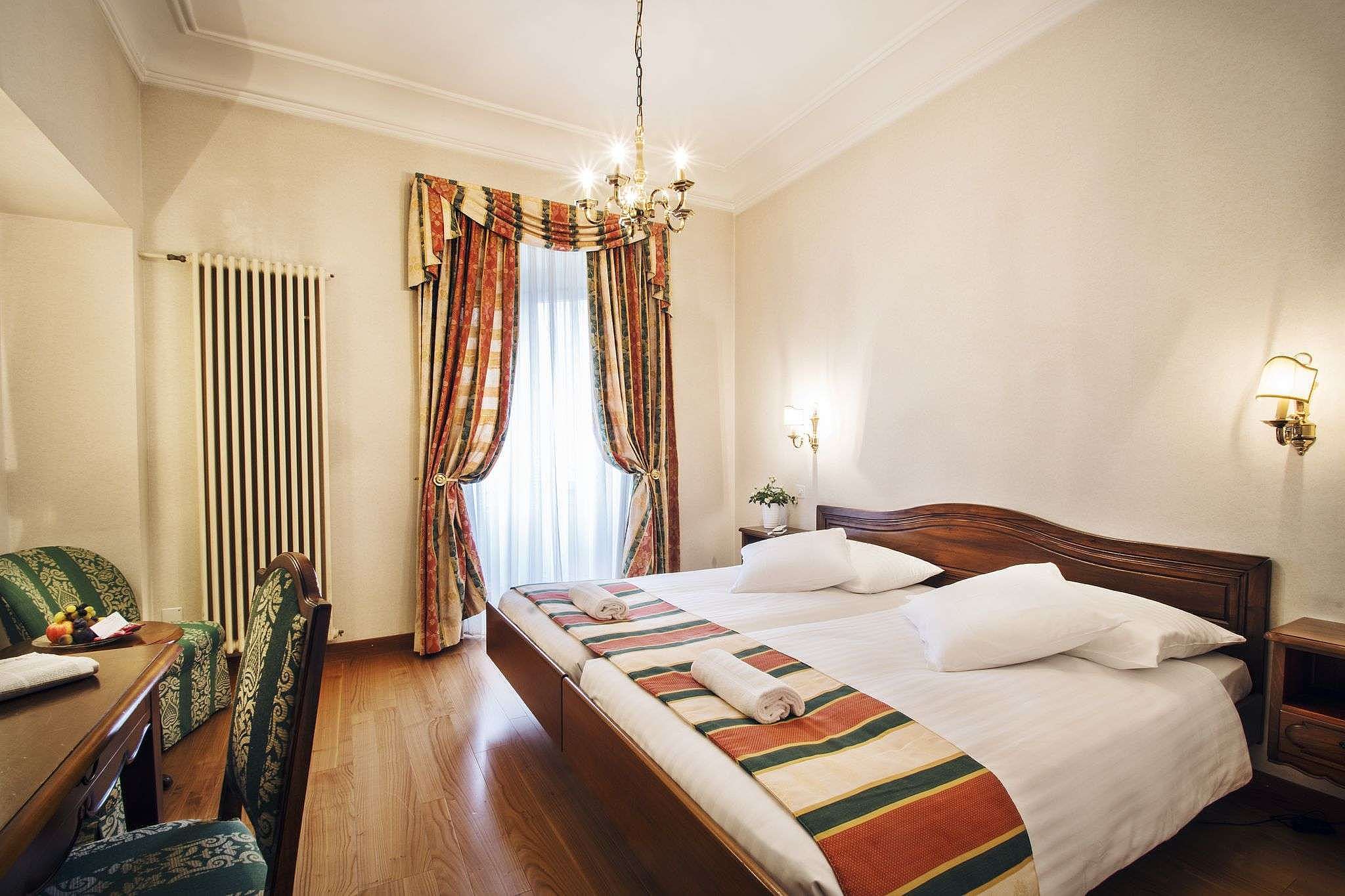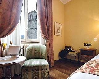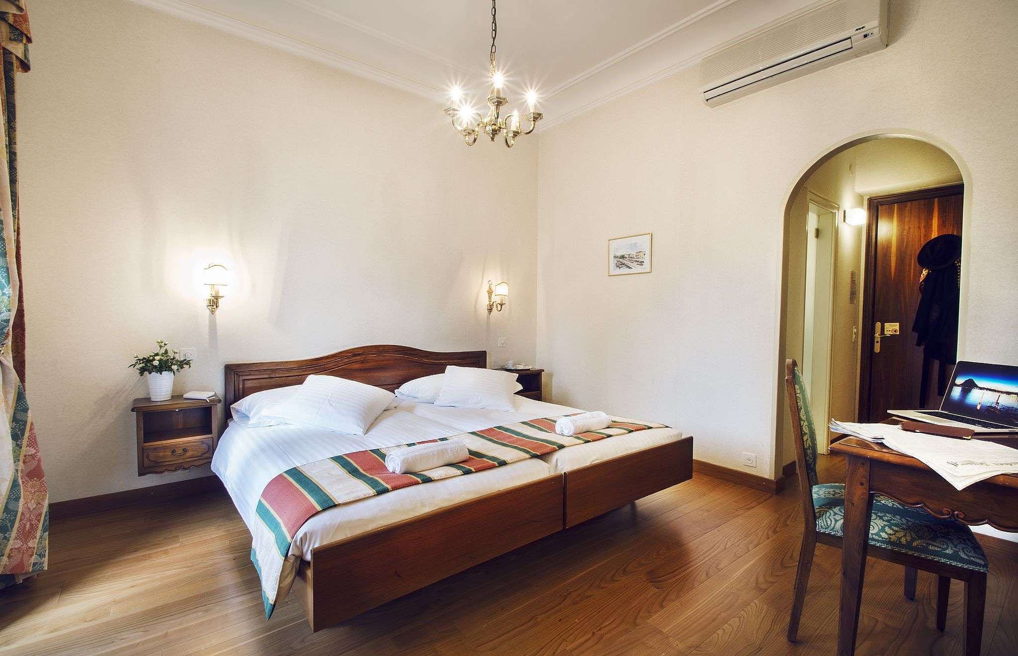 Helles Doppelzimmer ‘Classic mit Aussicht’ auf die bekannte Kirche S. Maria degli Angioli, den restaurierten Kreuzgang und kleiner Fernblick auf den See. Ein Doppel-oder zwei beieinanderstehende Betten, mit Klimaanlage, gratis WiFi, Bad/Dusche und mit elegantem Parkett.