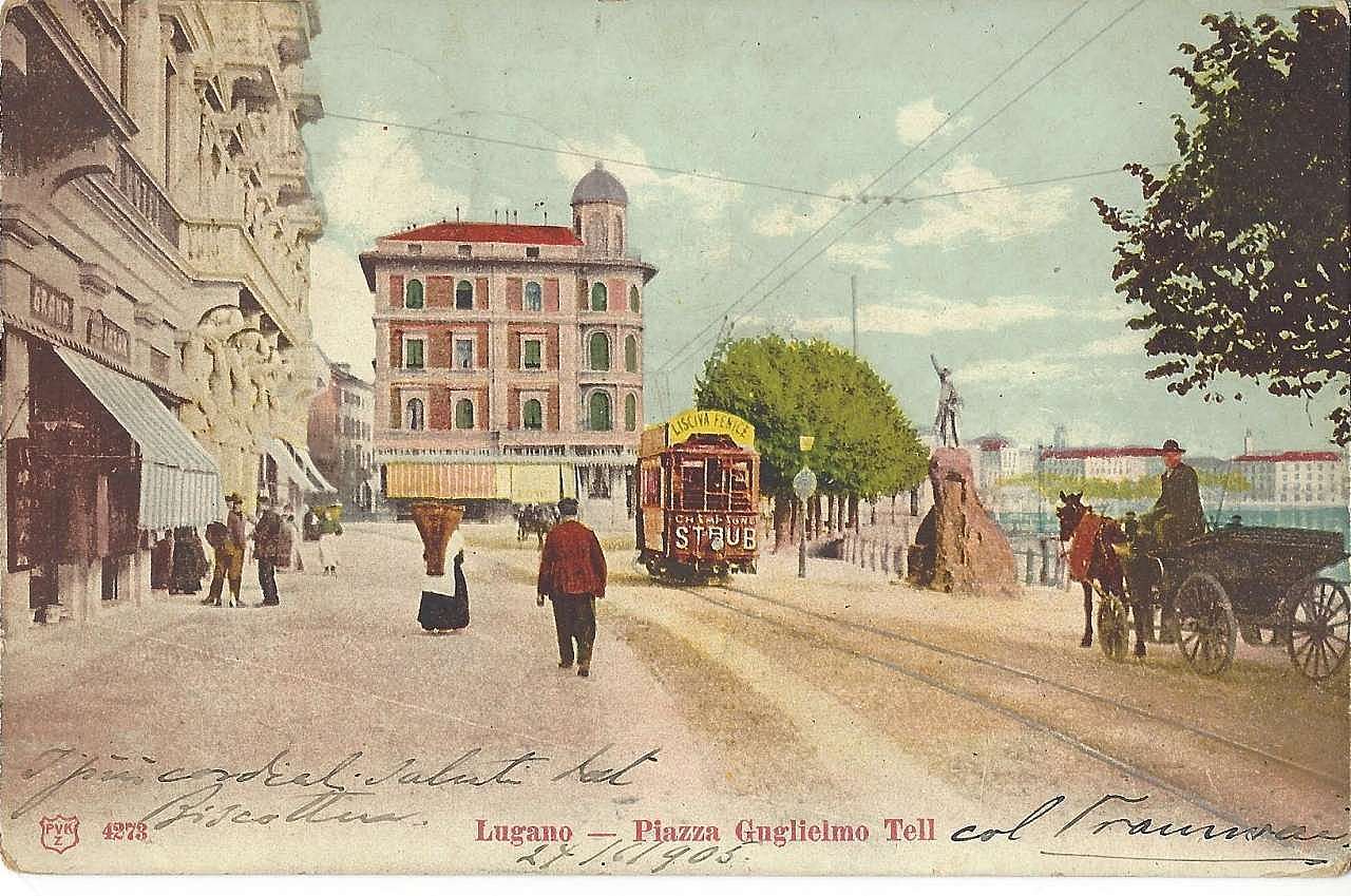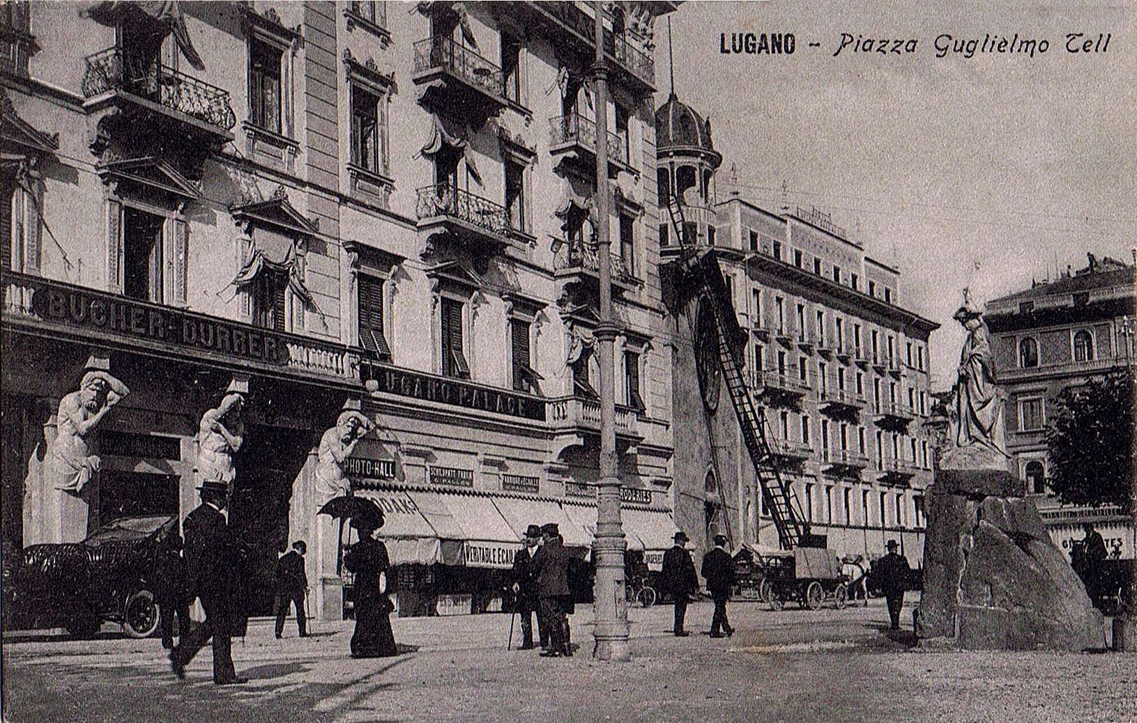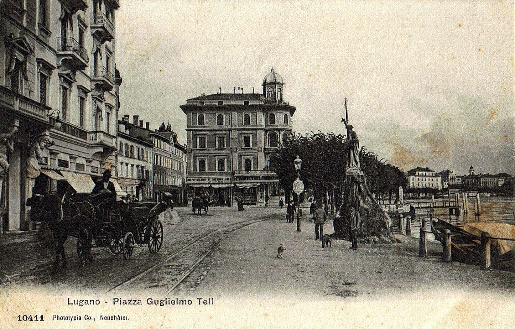 La place aujourd’hui connue sous le nom de Piazza Bernardino Luini plonge ses racines dans la seconde moitié du XIXe siècle, lorsqu’elle portait le nom de Piazza Guglielmo Tell et accueillait la statue du héros national sculptée par Vincenzo Vela en 1856. Elle représentait alors le cœur du nouveau front de lac, à une époque où Lugano commençait à se transformer d’un bourg marchand en ville touristique. Avec l’essor du quai du lac et la construction de grands hôtels — parmi lesquels le Grand Palace Hotel et l’International au Lac — la place devint un lieu de rencontre et de passage pour voyageurs, habitants et villégiateurs venus de toute l’Europe.