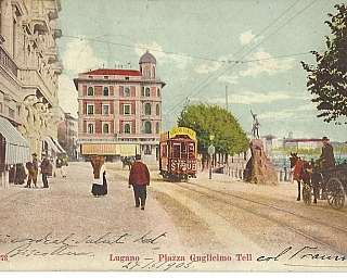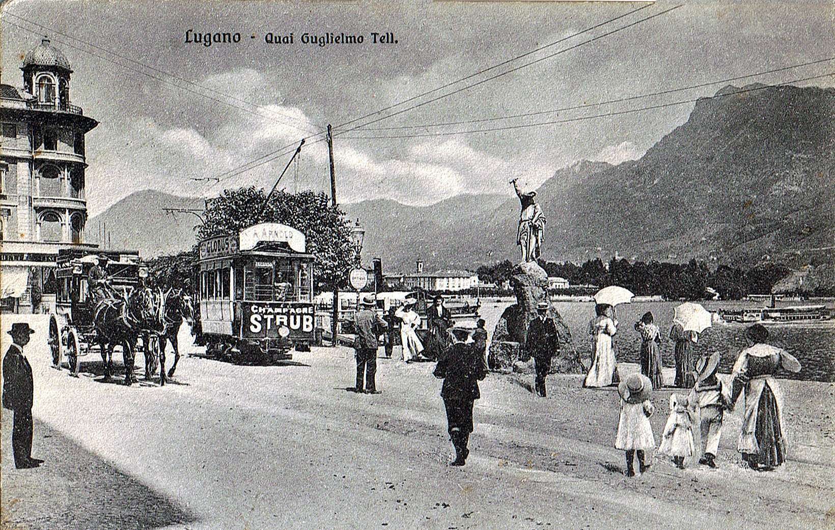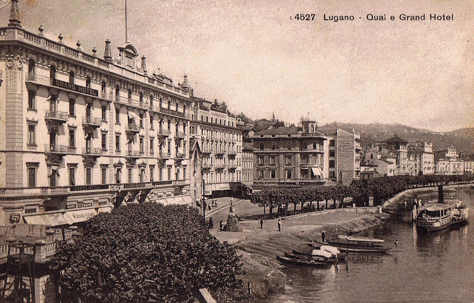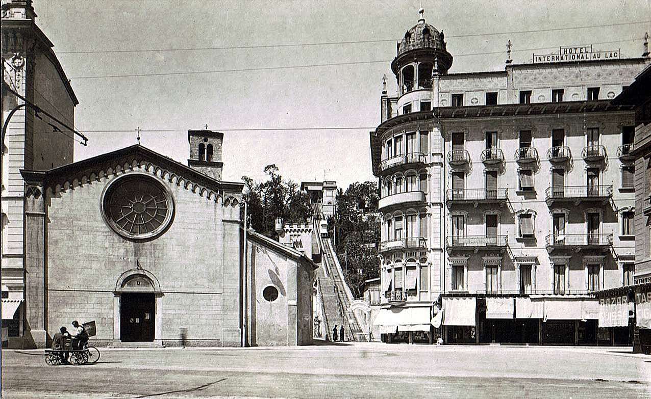 La place aujourd’hui connue sous le nom de Piazza Bernardino Luini plonge ses racines dans la seconde moitié du XIXe siècle, lorsqu’elle portait le nom de Piazza Guglielmo Tell et accueillait la statue du héros national sculptée par Vincenzo Vela en 1856. Elle représentait alors le cœur du nouveau front de lac, à une époque où Lugano commençait à se transformer d’un bourg marchand en ville touristique. Avec l’essor du quai du lac et la construction de grands hôtels — parmi lesquels le Grand Palace Hotel et l’International au Lac — la place devint un lieu de rencontre et de passage pour voyageurs, habitants et villégiateurs venus de toute l’Europe.