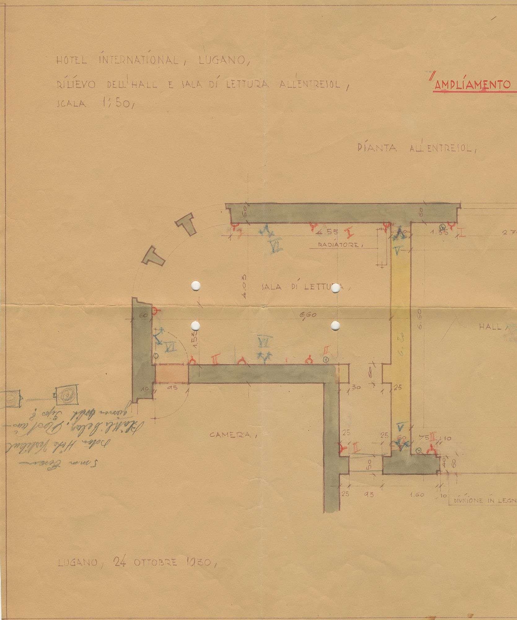 Lorsque l’hôtel ouvrit au printemps 1906, la chambre numéro 9, avec balcon et vue sur le lac, se trouvait encore du côté avant du salon. La paroi qui la séparait du « Vestibule » était richement décorée, probablement avec un grand miroir encadré, placé de manière à refléter la lumière de la cheminée située en face. Quelques tapis orientaux ornaient le sol en marbre, rendant l’ambiance plus chaleureuse et accueillante.