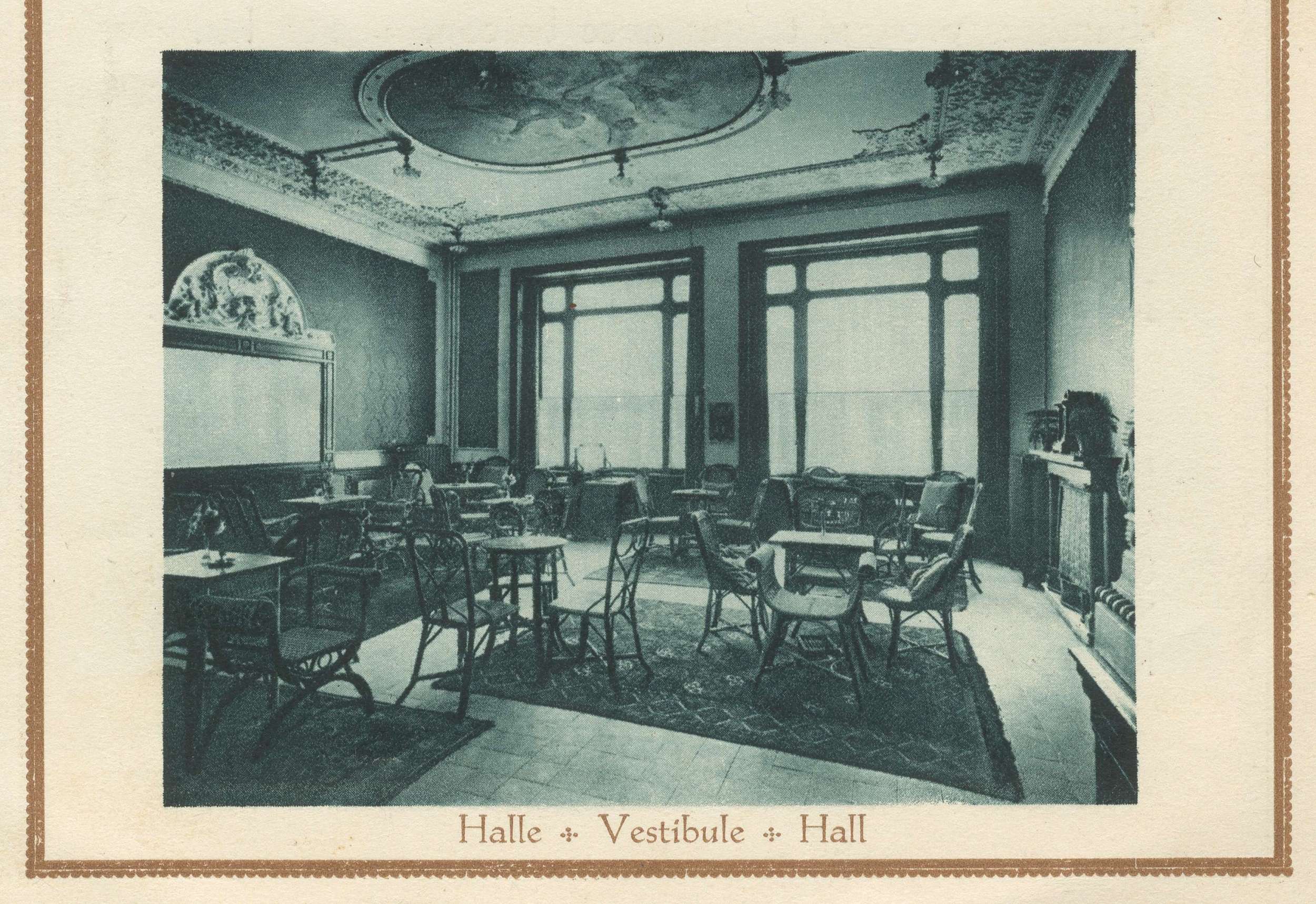 Selon les plans originaux de 1906, l’actuel salon de l’hôtel était désigné sous le nom de « Vestibule », terme dérivé du latin qui signifie « antichambre derrière la porte d’entrée », donc un espace de transition. Là, neuf groupes de sièges en rotin de deux à six places offraient aux hôtes la possibilité de se retrouver ou de s’asseoir tranquillement dans une sorte de no man’s land, un espace neutre où attendre le check-in, exhiber une nouvelle tenue ou, à l’heure du thé, observer qui entrait et sortait de l’hôtel.