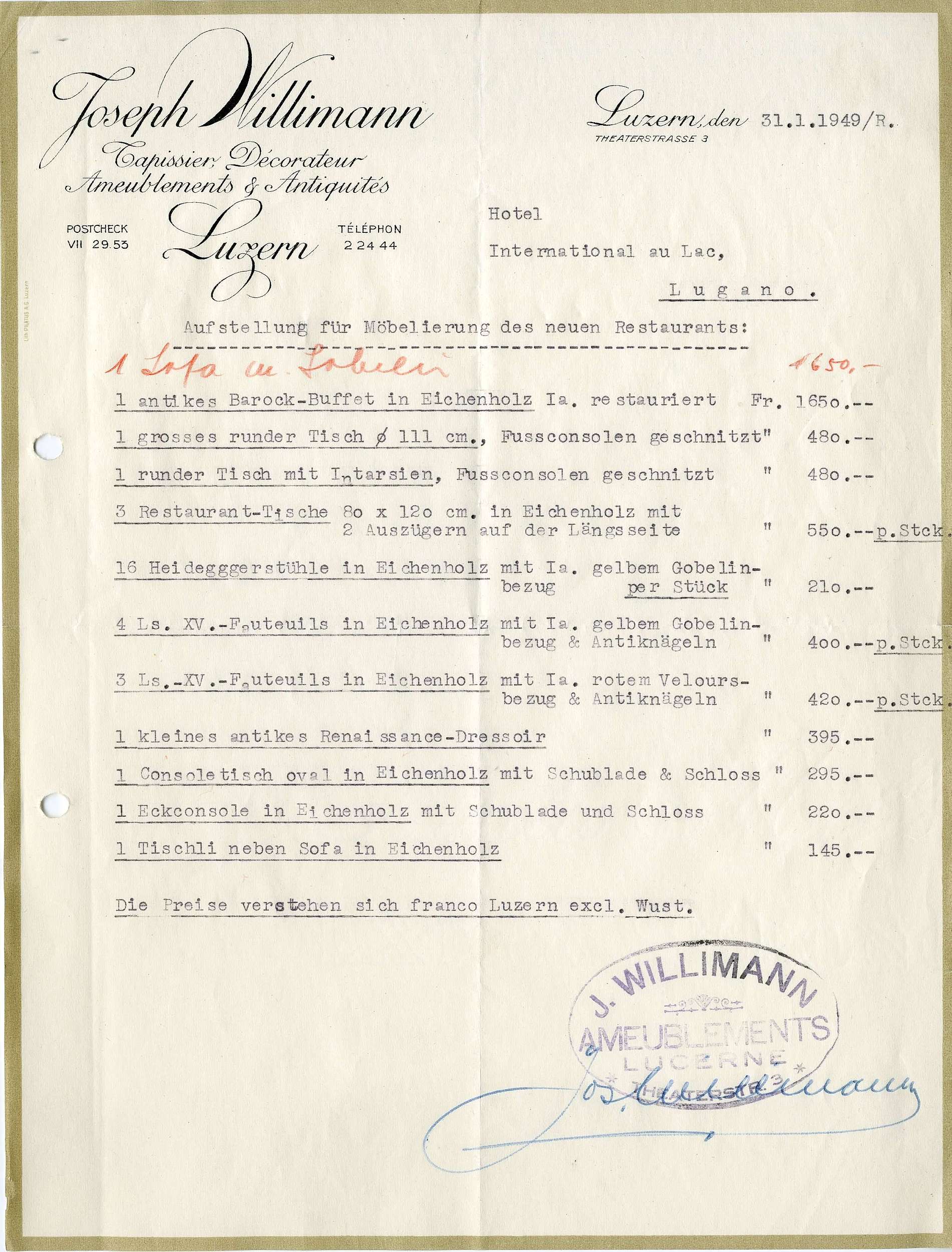 En janvier 1943, le mobilier actuel du salon fut acheté auprès de la maison Willimann à Lucerne et, au fil des années, il fut restauré à plusieurs reprises tout en conservant son style. Aujourd’hui encore, renouvelés dans leurs revêtements, ces meubles accueillent les hôtes de l’hôtel.