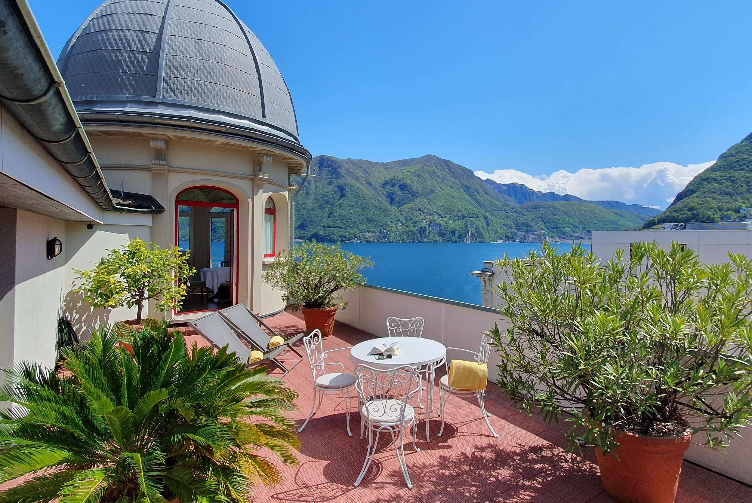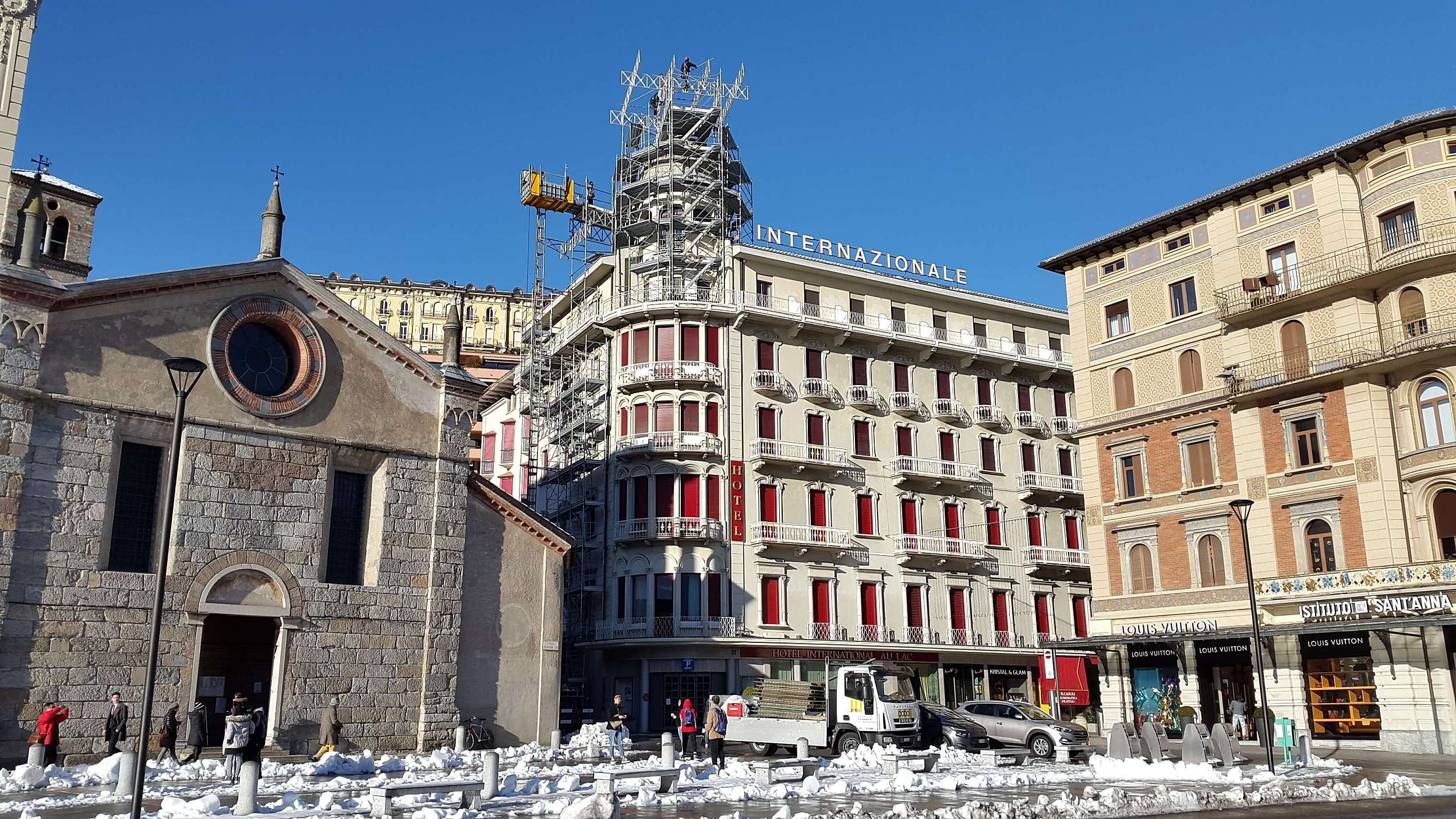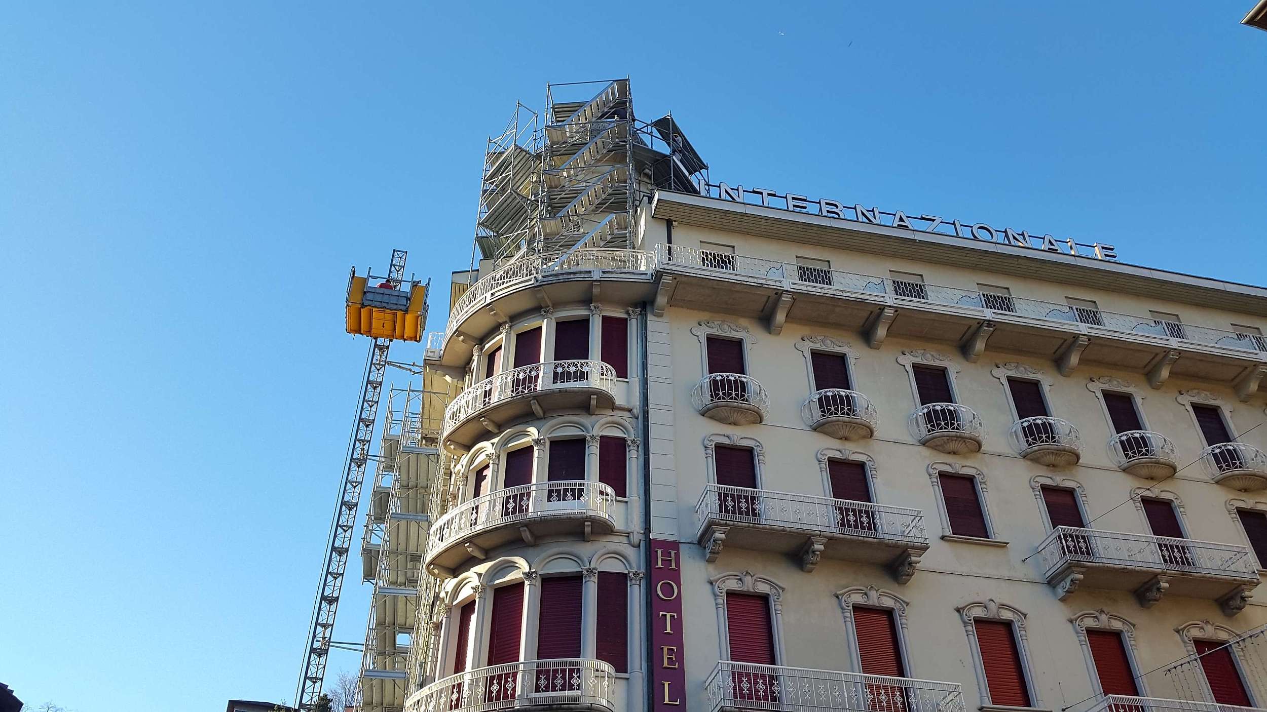L’emblématique coupole de l’Hotel International au Lac a retrouvé tout son éclat grâce à une restauration conservatrice entamée à l’automne 2017 et achevée en mars 2018, sous l’œil attentif de Roberto Schmid. Au cours des travaux, après avoir retiré le revêtement marqué par le temps, les charpentes et structures métalliques ajoutées au fil des décennies ont également été supprimées, témoins d’interventions successives.