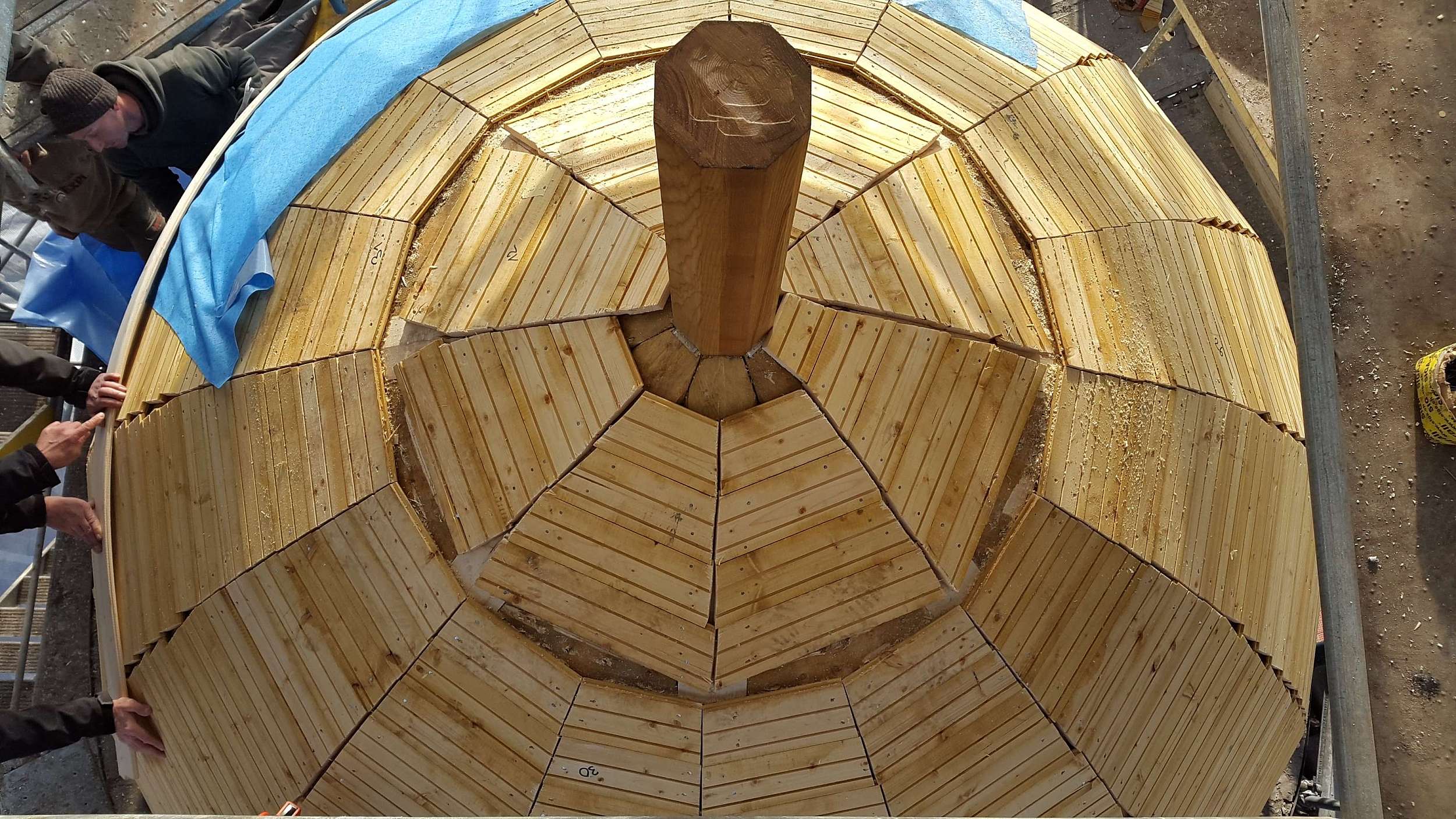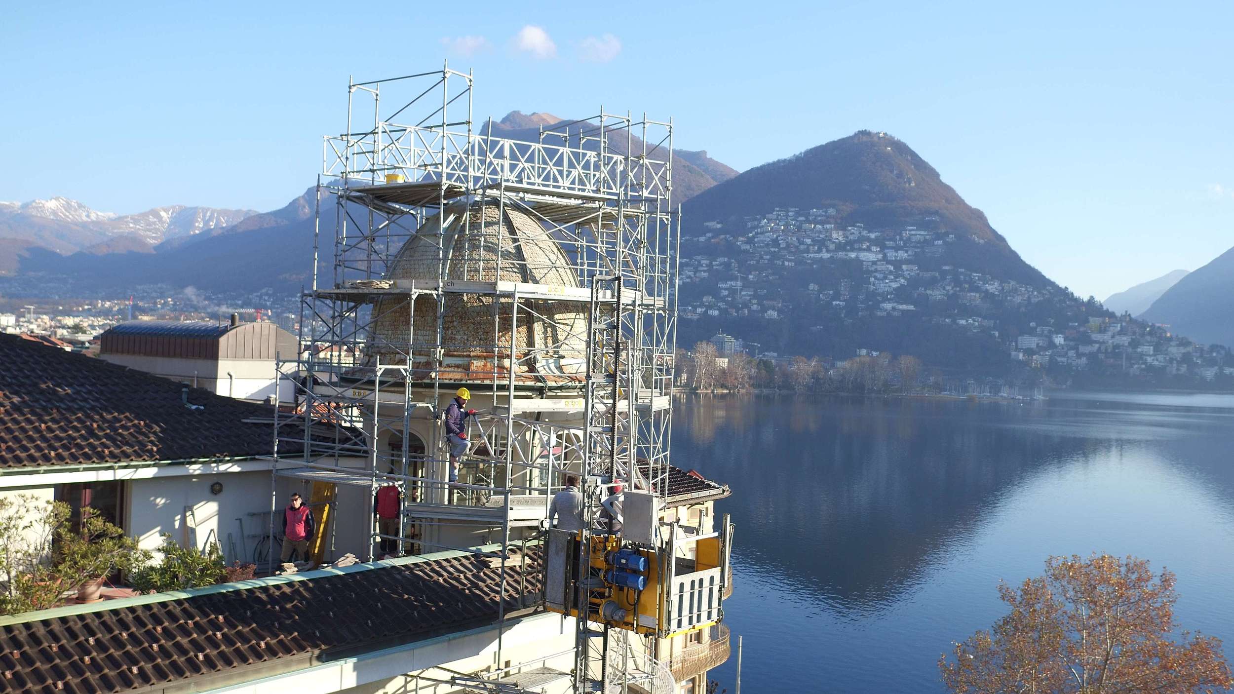 Une fois la base maçonnée rétablie dans son état d’origine, les charpentiers ont réalisé une nouvelle structure porteuse en bois, habillée de matériaux nobles tels que le quartz-zinc et le zinc naturel prépatiné, utilisés dans la restauration de palais et de monuments historiques à travers l’Europe. Entièrement conçue et réalisée par des artisans tessinois, la nouvelle coupole a été inaugurée en avril 2018.