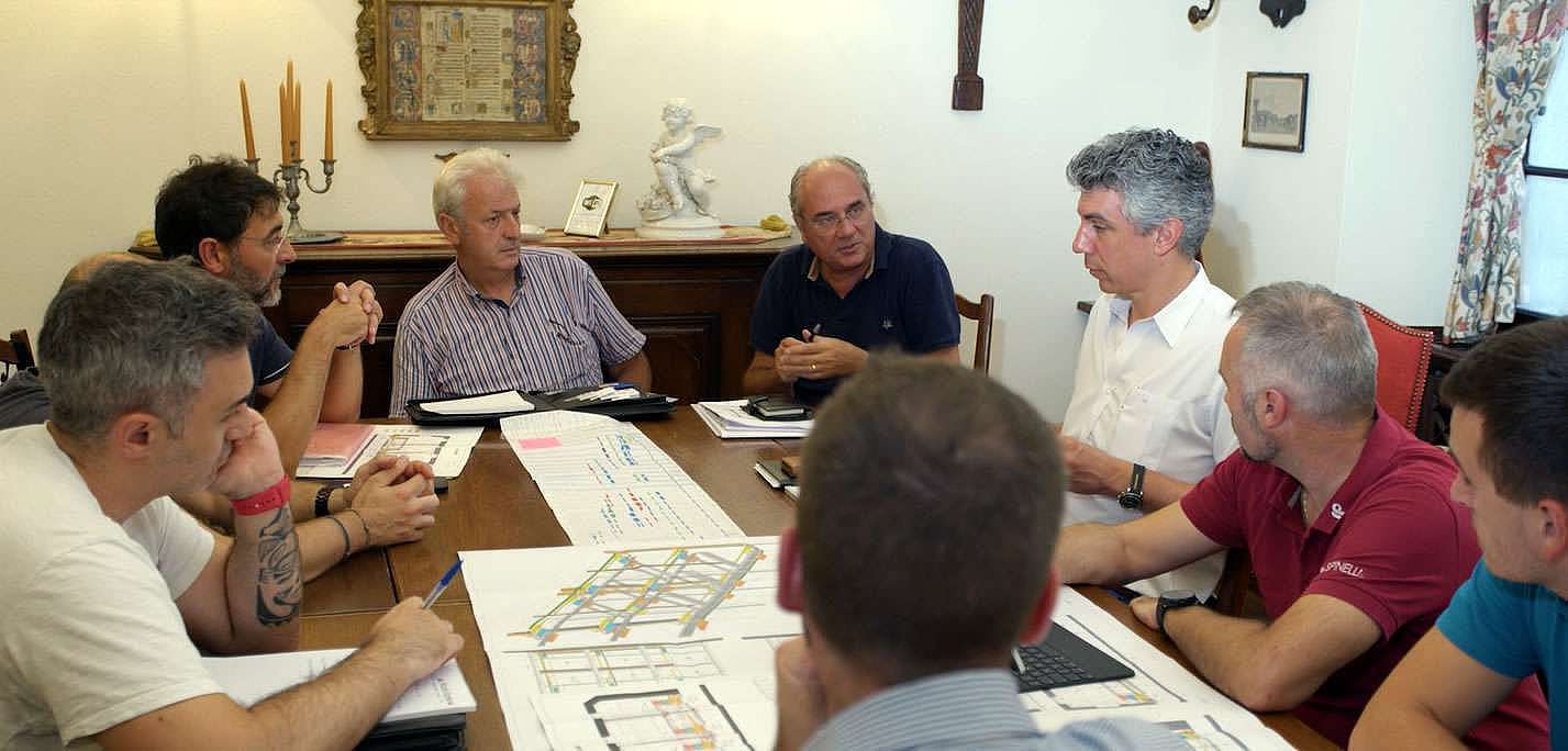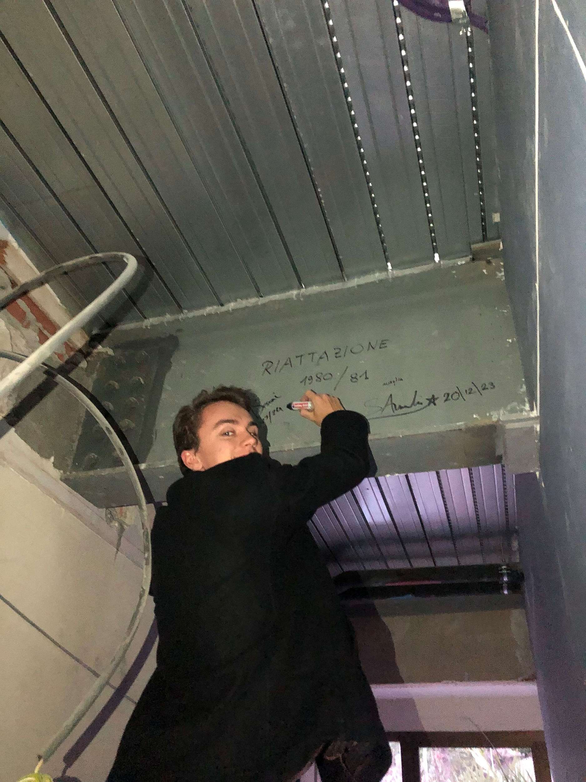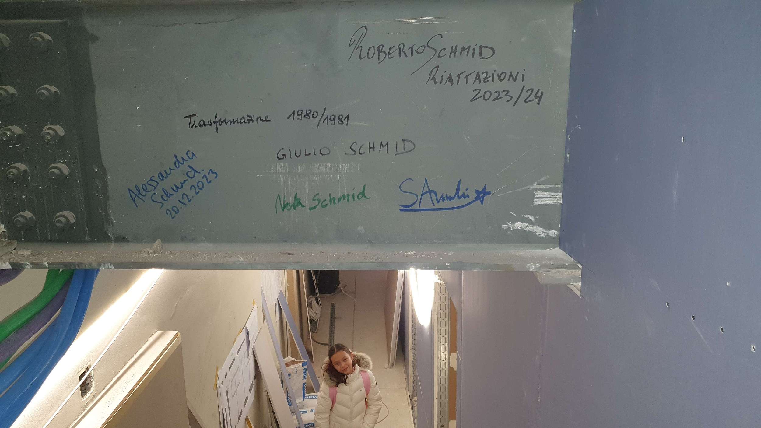 Sur les images ci-contre réapparaît le témoignage d’un ouvrage réalisé par Giulio Schmid (3ème génération). Après 43 ans, il redevient visible grâce à un nouveau projet de rénovation dirigé par Roberto Schmid, tandis que la poutre porteuse en acier est complétée par les signatures de la 4ème et 5ème génération.